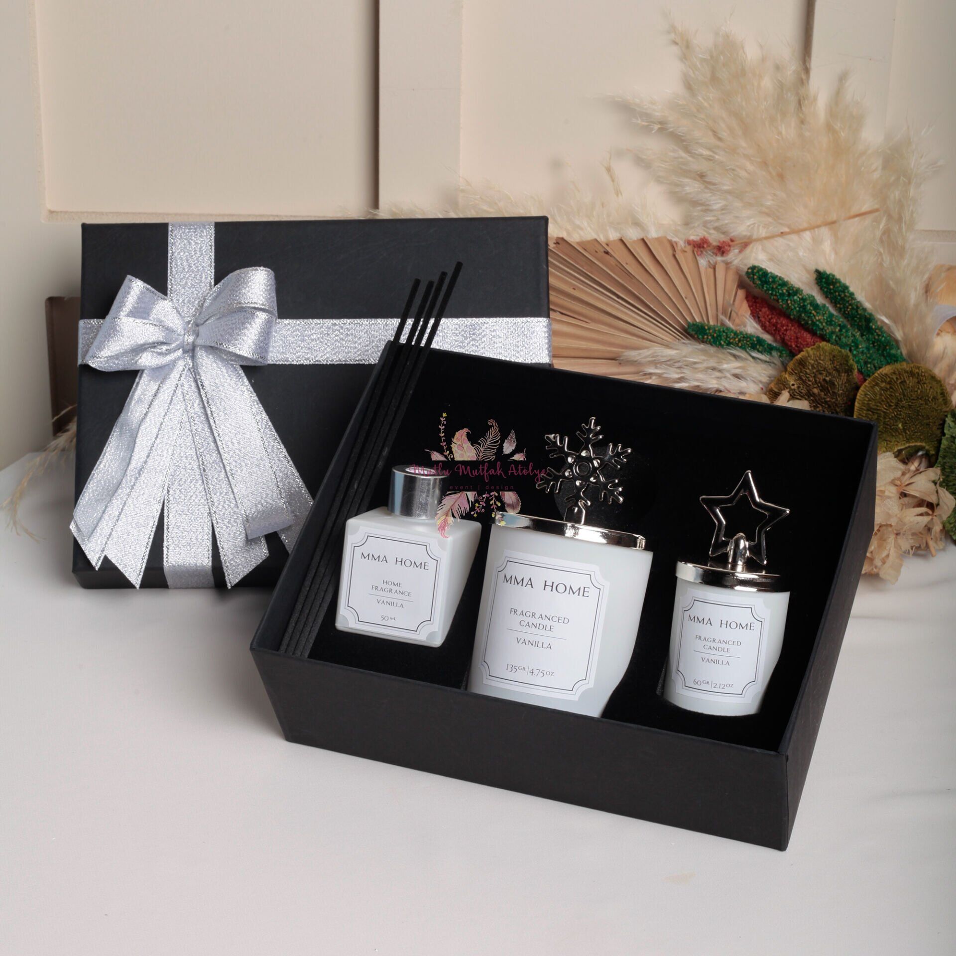 Kutu içeriğinde 1 adet küçük boy vanilya kokulu mum, 1 adet büyük boy vanilya kokulu mum, 1 adet oda kokusu ve 4 adet siyah fiber oda kokusu çubuğu bulunmaktadır.