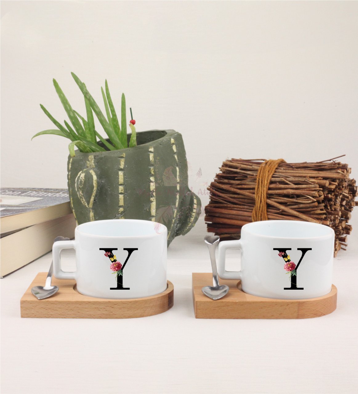Y Harfi Çiçek Desenli İkili Ahşap Altlıklı Fincan