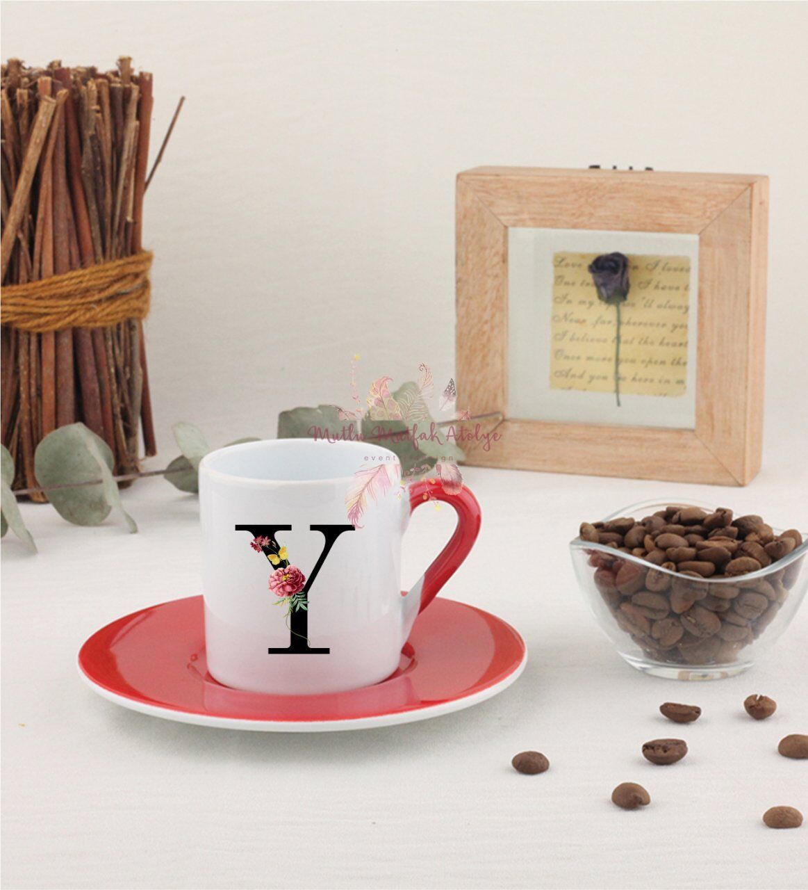 Y Harfi Çiçek Desenli Kırmızı Türk Kahvesi Fincanı