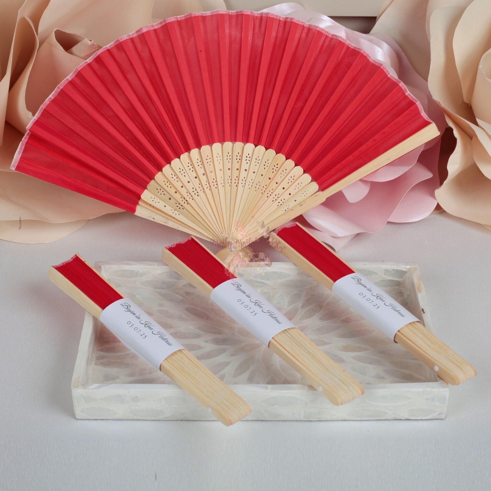 Söz, nişan, kına, düğün gibi organizasyonlarınızda misafirlerinize şıklığıyla dikkat çeken ve aynı zamanda sıcak yaz günlerinde ferahlatıcı bir detay sunan bu özel yelpazeler, konseptinize zarif bir dokunuş katar.